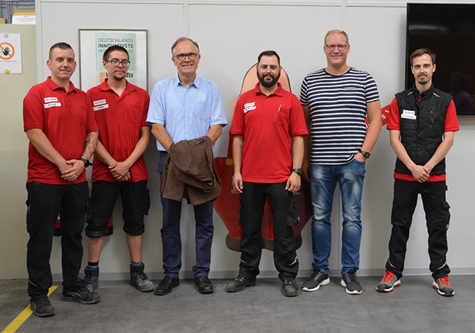 Begrüßt wurden Pluskat, Leiter der kaufmännischen Ausbildung und sein Stellvertreter Fischer von Personalleiter Uwe Werner sowie ihren ehemaligen Schülern Atchen Morales und Marco Kruhl, beide aktuell Hanchos in der LEAN FACTORY. Morales hatte den Kontakt zur Schule, unter anderem durch seine kürzlich erfolgreich abgelegte Weiterbildung zum Logistikmeister, nie verloren und diesen Besuch hauptverantwortlich organisiert.